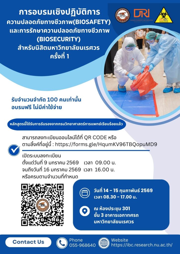 ข่าวการจัดกิจกรรม การอบรมเชิงปฏิบัติการหลักสูตรความปลอดภัยทางชีวภาพ (Biosafety) และการรักษาความปลอดภัยทางชีวภาพ (Biosecurity) สำหรับนิสิตมหาวิทยาลัยนเรศวร ครั้งที่ 1 ประจำปีงบประมาณ 2569 6 มกราคม 2026 การอบรมเชิงปฏิบัติการหลักสูตรความปลอดภัยทางชีวภาพ (Biosafety) และการรักษาความปลอดภัยทางชีวภาพ (Biosecurity) สำหรับนิสิตมหาวิทยาลัยนเรศวร ครั้งที่ 2 ประจำปีงบประมาณ 2568 18 มิถุนายน 2025 การอบรมส่งเสริมความรู้ความเข้าใจในงานวิจัยที่เกี่ยวข้องกับพันธุ์พืช 18 มิถุนายน 2025 การอบรมเชิงปฏิบัติการหลักสูตรความปลอดภัยทางชีวภาพ (Biosafety) และการรักษาความปลอดภัยทางชีวภาพ (Biosecurity) สำหรับอาจารย์ และบุคลากรของมหาวิทยาลัยนเรศวร 22 พฤษภาคม 2025 การอบรมส่งเสริมความรู้ความเข้าใจในการกรอกแบบฟอร์มด้านความปลอดภัยทางชีวภาพ สำหรับนิสิต นักวิจัยของมหาวิทยาลัยนเรศวร 21 พฤษภาคม 2025