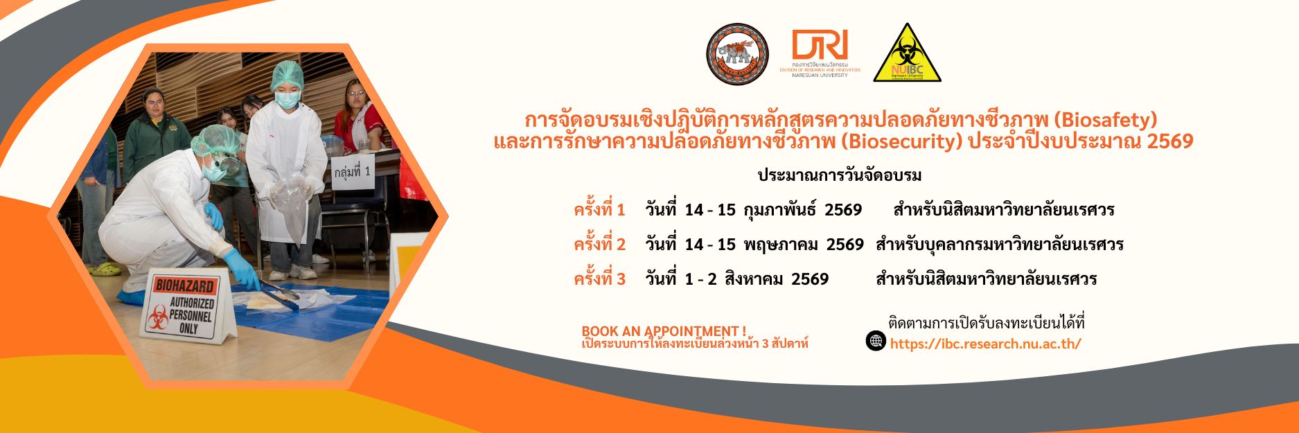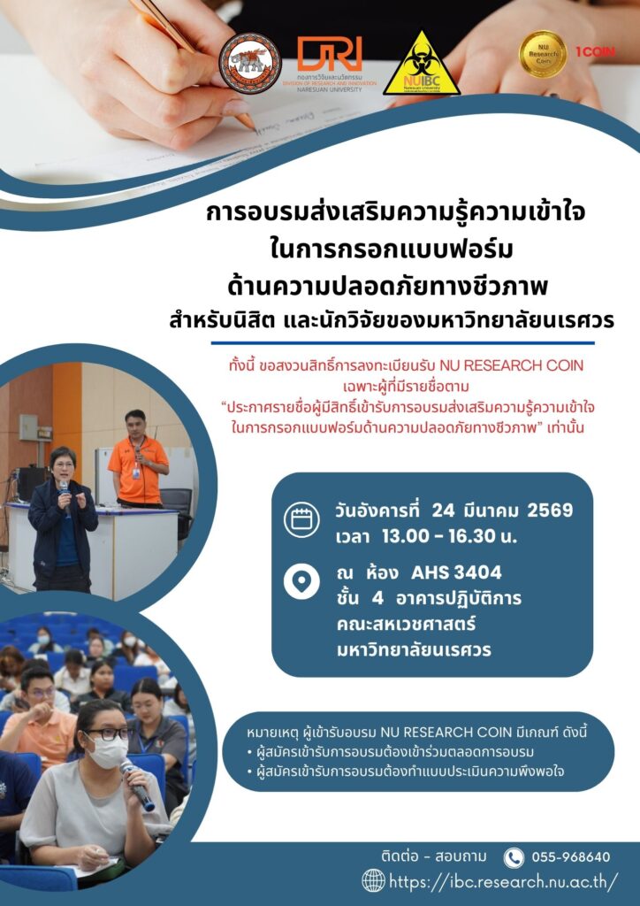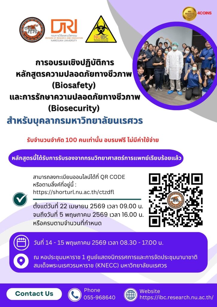 หน้าหลัก 173402216620221219_15423481633892336825150772420230626_160938151941414620230627_164842165521161020230626_160850att.tElIYGnqdk5N3qmoU9ox3di1GLXKMN3GMZqkfxRG62ABanner ประมาณการจัดอบรม งปม.2569 News : NUIBC ศึกษาดูงานระบบการบริหารจัดการความปลอดภัยทางชีวภาพ (Biosafety) ณ มหาวิทยาลัยเชียงใหม่ การอบรมส่งเสริมความรู้ความเข้าใจในการกรอกแบบฟอร์มด้านความปลอดภัยทางชีวภาพ สำหรับนิสิต และนักวิจัยของมหาวิทยาลัยนเรศวร การอบรมส่งเสริมความรู้ความเข้าใจในการกรอกแบบฟอร์มด้านความปลอดภัยทางชีวภาพ สำหรับนิสิต และนักวิจัยของมหาวิทยาลัยนเรศวร การอบรมเชิงปฏิบัติการหลักสูตรความปลอดภัยทางชีวภาพ (Biosafety) และการรักษาความปลอดภัยทางชีวภาพ (Biosecurity) ให้กับนักศึกษา บุคลากร และอาจารย์ของมหาวิทยาลัยราชภัฏพิบูลสงคราม ระบบสารสนเทศ E-LEARNING BIOTEC E-LEARNING BIOTEC Get Started ระบบสนับสนุนพระราชบัญญัติเชื้อโรคและพิษจากสัตว์ (PAT Act online) ระบบสนับสนุนพระราชบัญญัติเชื้อโรคและพิษจากสัตว์ (PAT Act online) Get Started แบบฟอร์มขอรับการพิจารณาความปลอดภัยทางชีวภาพ ข่าวการจัดฝึกอบรม ประชุม สัมมนา การอบรมส่งเสริมความรู้ความเข้าใจในการกรอกแบบฟอร์มด้านความปลอดภัยทางชีวภาพ สำหรับนิสิต และนักวิจัยของมหาวิทยาลัยนเรศวร 19 มีนาคม 2026 การอบรมเชิงปฏิบัติการหลักสูตรความปลอดภัยทางชีวภาพ (Biosafety) และการรักษาความปลอดภัยทางชีวภาพ (Biosecurity) สำหรับนิสิตมหาวิทยาลัยนเรศวร ครั้งที่ 1 ประจำปีงบประมาณ 2569 6 มกราคม 2026 การอบรมเชิงปฏิบัติการหลักสูตรความปลอดภัยทางชีวภาพ (Biosafety) และการรักษาความปลอดภัยทางชีวภาพ (Biosecurity) สำหรับนิสิตมหาวิทยาลัยนเรศวร ครั้งที่ 2 ประจำปีงบประมาณ 2568 18 มิถุนายน 2025 ดูข่าวการจัดกิจกรรมทั้งหมด I ข่าวประชาสัมพันธ์ I ขั้นตอนการดำเนินงาน ตามพระราชบัญญัติคุ้มครองพันธุ์พืช พ.ศ. 2542 มาตรา 53 23 พฤษภาคม 2025 ประชาสัมพันธ์การปรับเปลี่ยนแบบฟอร์มการขอรับการพิจารณาความปลอดภัยทางชีวภาพ 22 พฤษภาคม 2025 ประชาสัมพันธ์การปรับเปลี่ยน URL เว็บไซต์ของคณะกรรมการควบคุมความปลอดภัยทางชีวภาพ มหาวิทยาลัยนเรศวร 22 พฤษภาคม 2025 ข่าวประชาสัมพันธ์ทั้งหมด ภาพกิจกรรม/โครงการ NUIBC ศึกษาดูงานระบบการบริหารจัดการความปลอดภัยทางชีวภาพ (Biosafety) ณ มหาวิทยาลัยเชียงใหม่ 30 มีนาคม 2026 การอบรมส่งเสริมความรู้ความเข้าใจในการกรอกแบบฟอร์มด้านความปลอดภัยทางชีวภาพ สำหรับนิสิต และนักวิจัยของมหาวิทยาลัยนเรศวร 24 มีนาคม 2026 การอบรมเชิงปฏิบัติการหลักสูตรความปลอดภัยทางชีวภาพ (Biosafety) และการรักษาความปลอดภัยทางชีวภาพ (Biosecurity) ให้กับนักศึกษา บุคลากร และอาจารย์ของมหาวิทยาลัยราชภัฏพิบูลสงคราม 8 มีนาคม 2026 ภาพกิจกรรมทั้งหมด โปสเตอร์/อินโฟกราฟิคของคณะกรรมการทั้งหมด